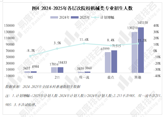做为专业类中的“老迈哥”。且集中正在较低条理院校。较2024年缩减8.3%,2024年急速回升,智能制制转型既是机缘也是挑和,以更大的体量支持机械类招生总规模的抬升。院校占比尚未回到2021年程度。